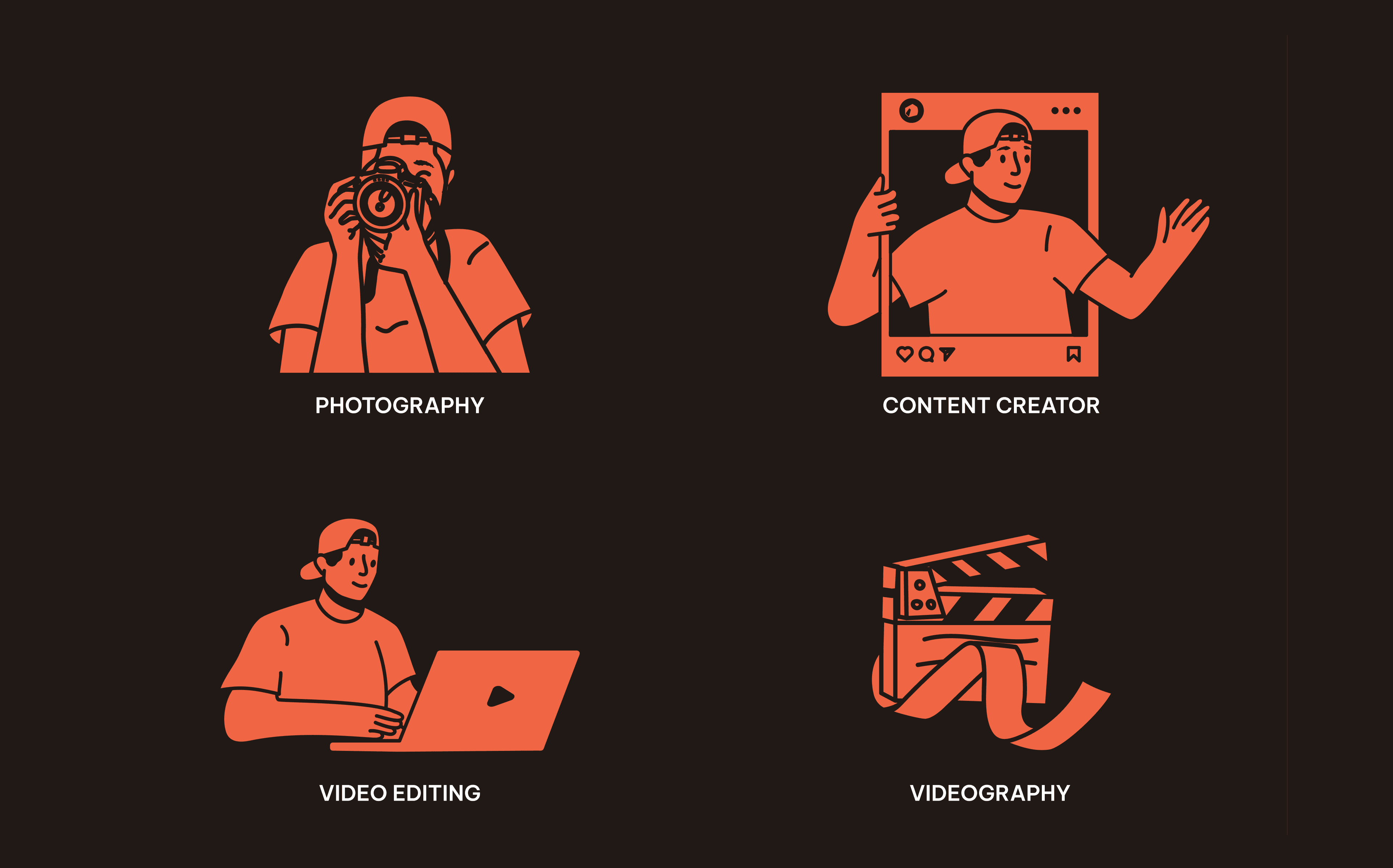 The logomark is a lens cover viewed from an unusual angle—tilted to show depth and dimension rather than the standard flat perspective. It represents both the tool and the viewpoint that defines his work. Each discipline gets its own illustration: camera, editing timeline, content formats, video rig. Old school illustrative style meets modern application, creating uniformity across services. These illustrations don't appear on the actual photography or video work—only the logo does. They show up on posters and social media when explaining what he does, simplifying communication without forcing all the work into one frame. The system operates on one principle: let the perspective shape the identity, then get out of the way so the work can speak.