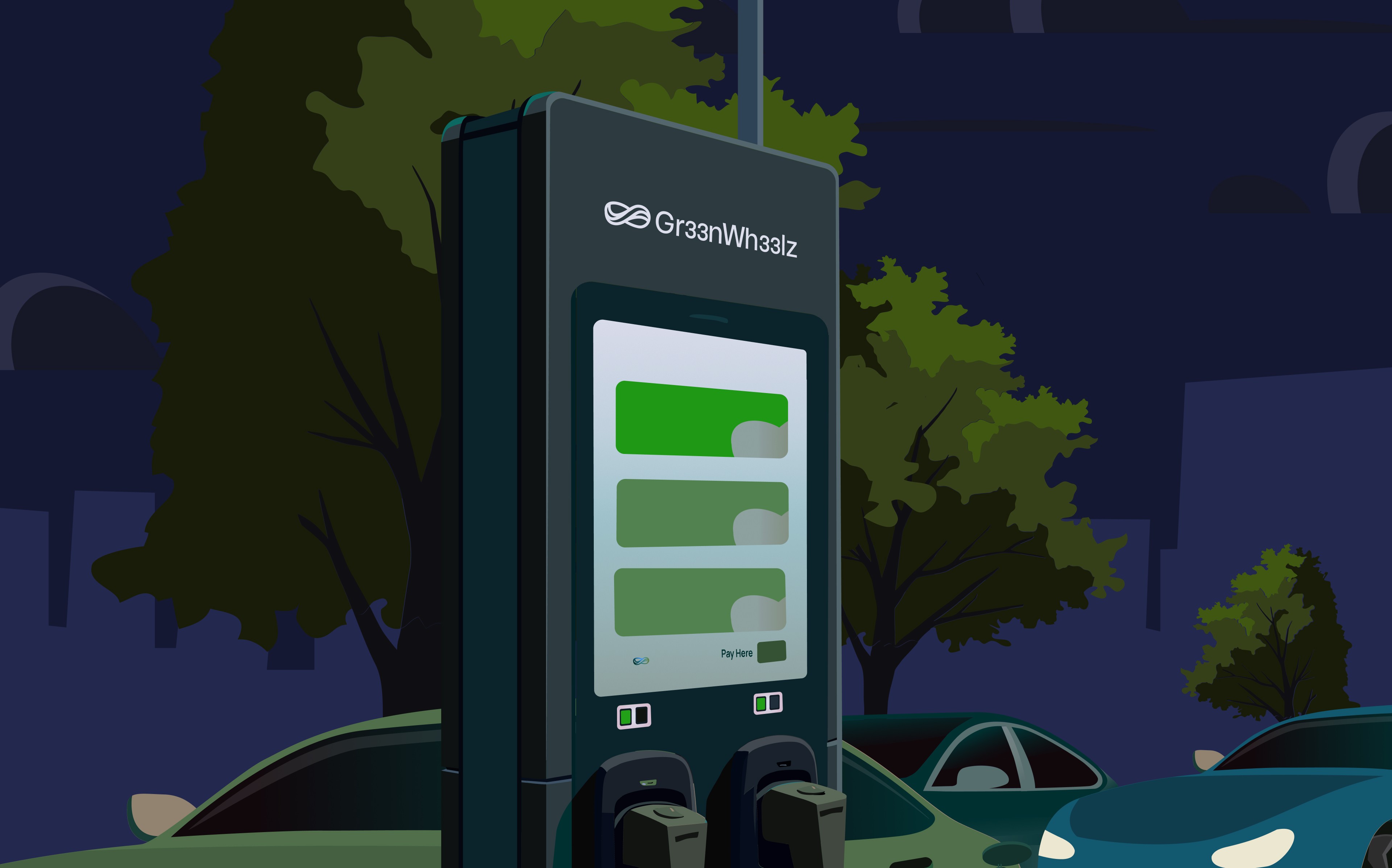 Electric car charging feels complicated because most platforms make it complicated. Gr33nwh33lz simplifies the experience; making charging accessible and seamless. The platform exists digitally and physically, so the identity needed to adapt across surfaces without losing clarity. Beyond the logo, the brand required illustrations that explain complex charging scenarios immediately and icons that work at any scale. The challenge was creating a system that says "future-focused" and "easy to use" at the same time, without the tech-forward aesthetic overwhelming people who just want to charge their car and go.