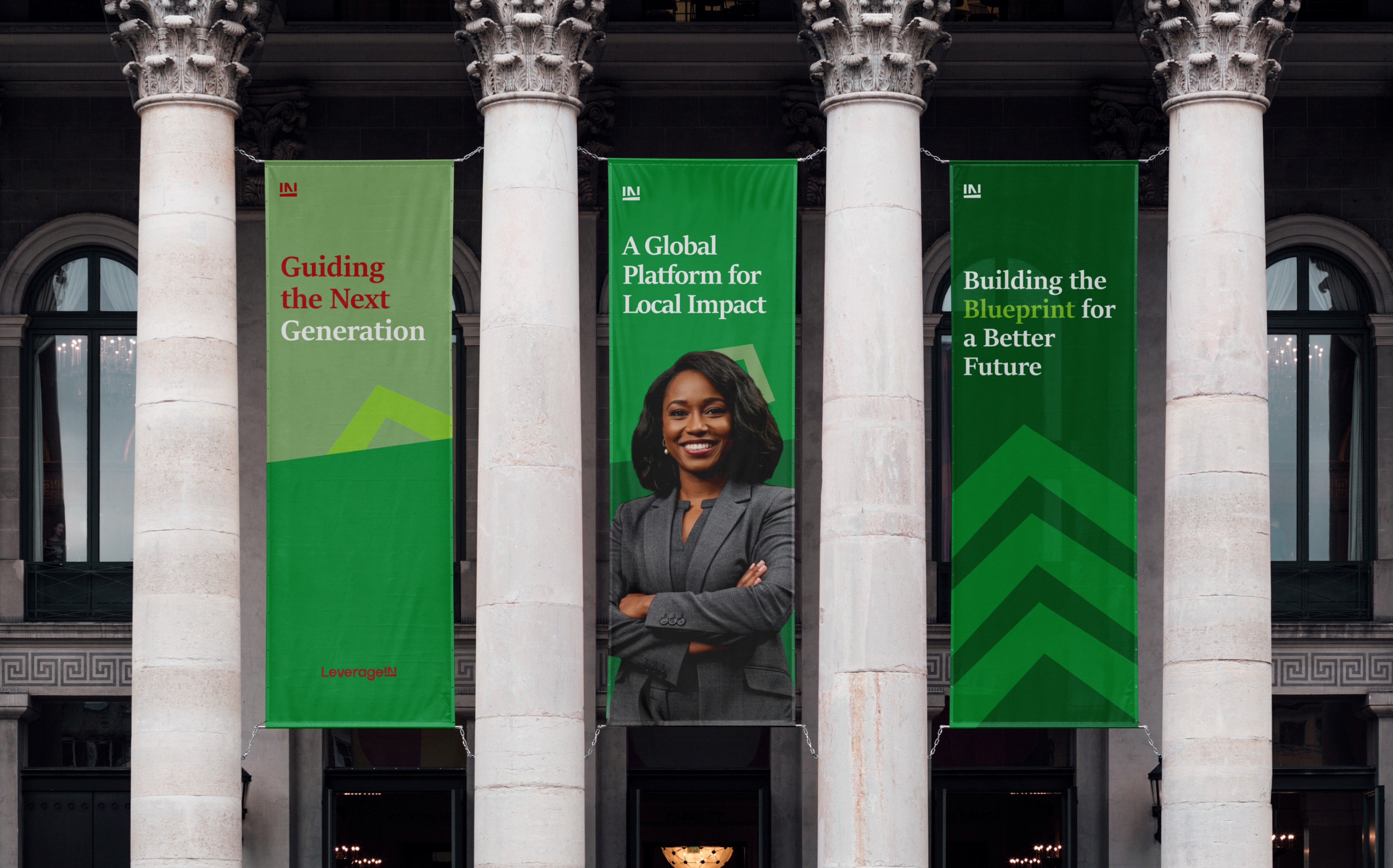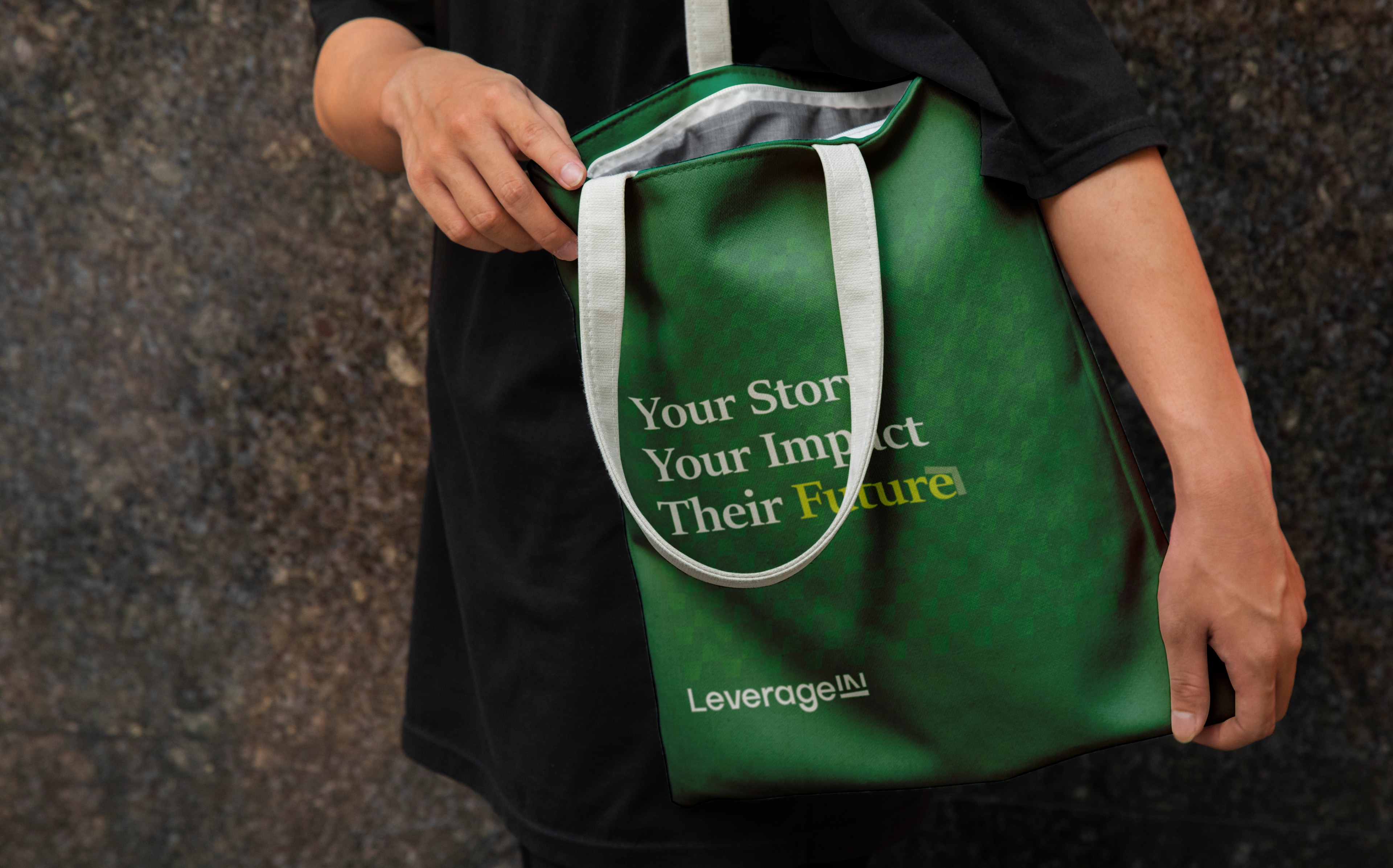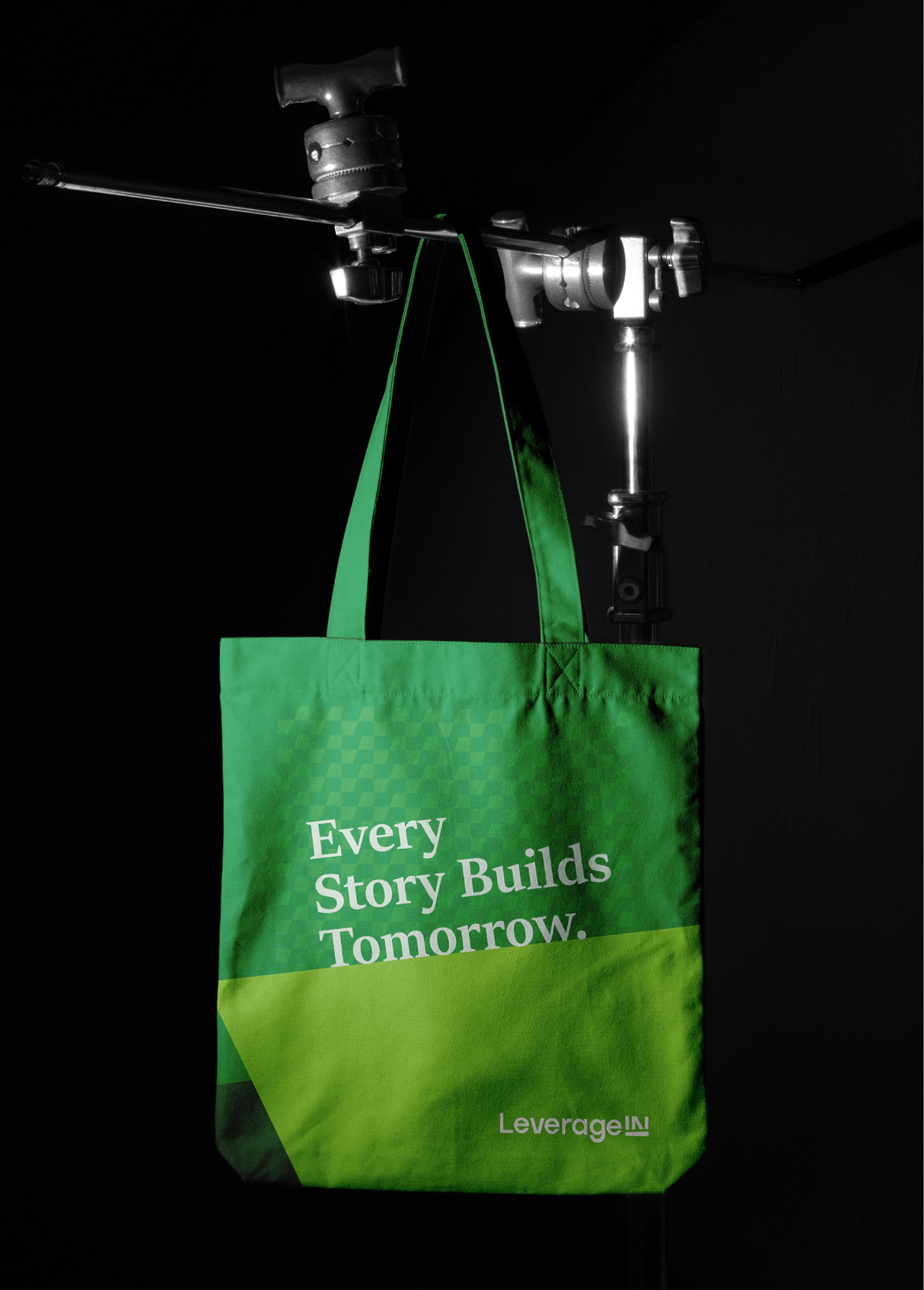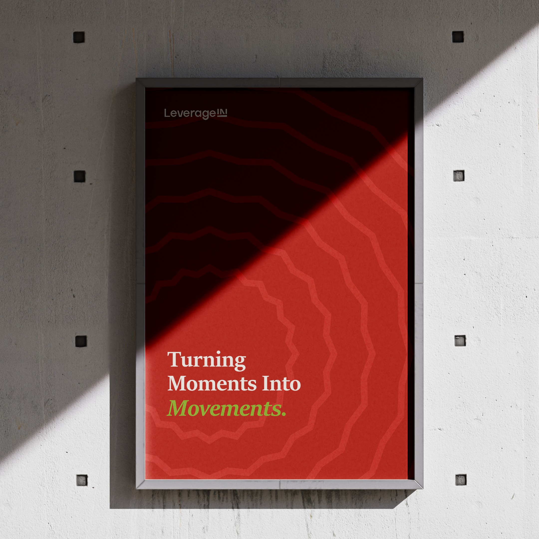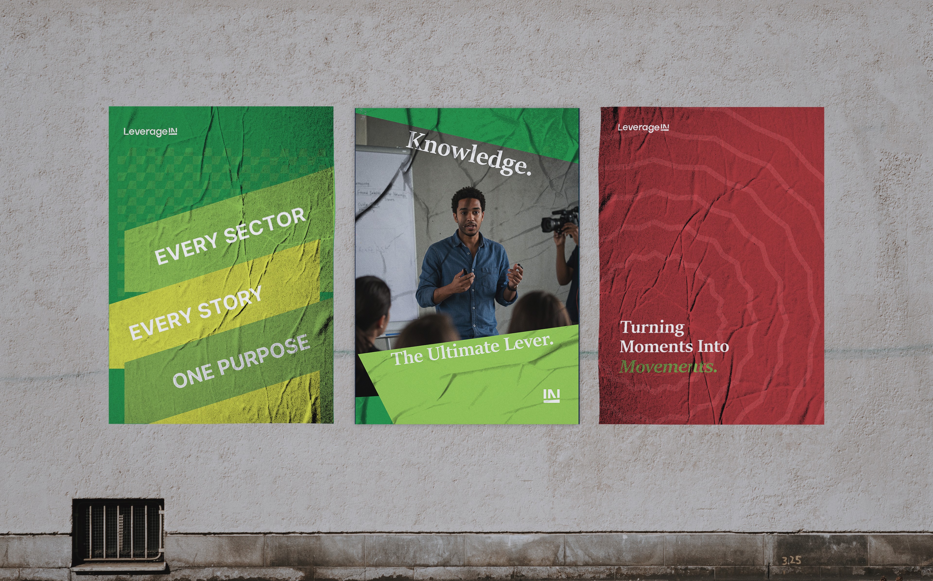 Knowledge dies when it's not documented. Ideas get lost, processes disappear, and the next generation starts from scratch. LeverageIN is a non-profit that preserves impactful actions through conferences and other mediums—creating a sustainable knowledge base where insights become lasting resources that can be repeated, adapted, and built upon. The challenge was creating an identity that communicated preservation and amplification without looking academic or archival. The brand needed to say "foundation" and "forward momentum" at the same time; documenting what matters while propelling it forward.