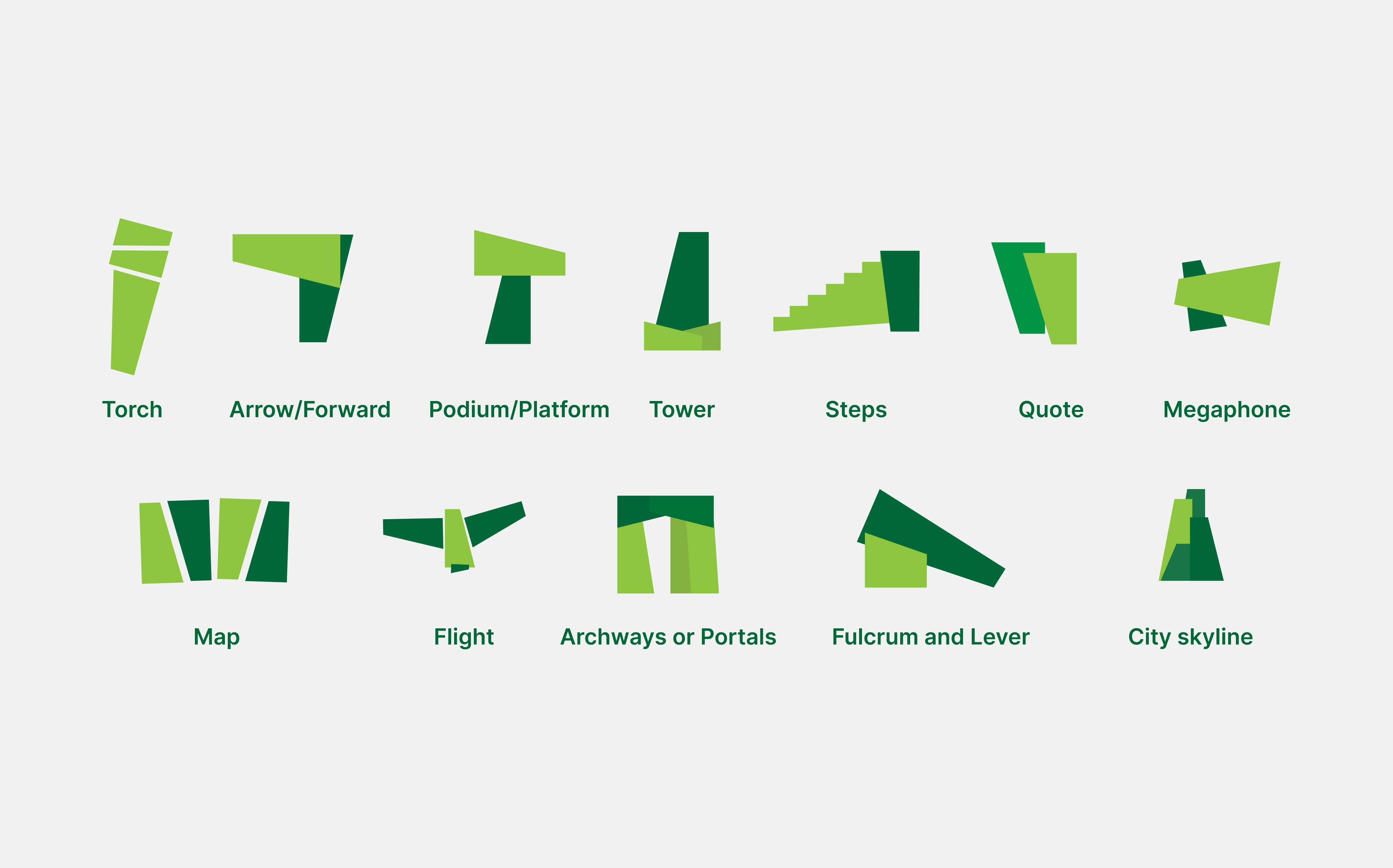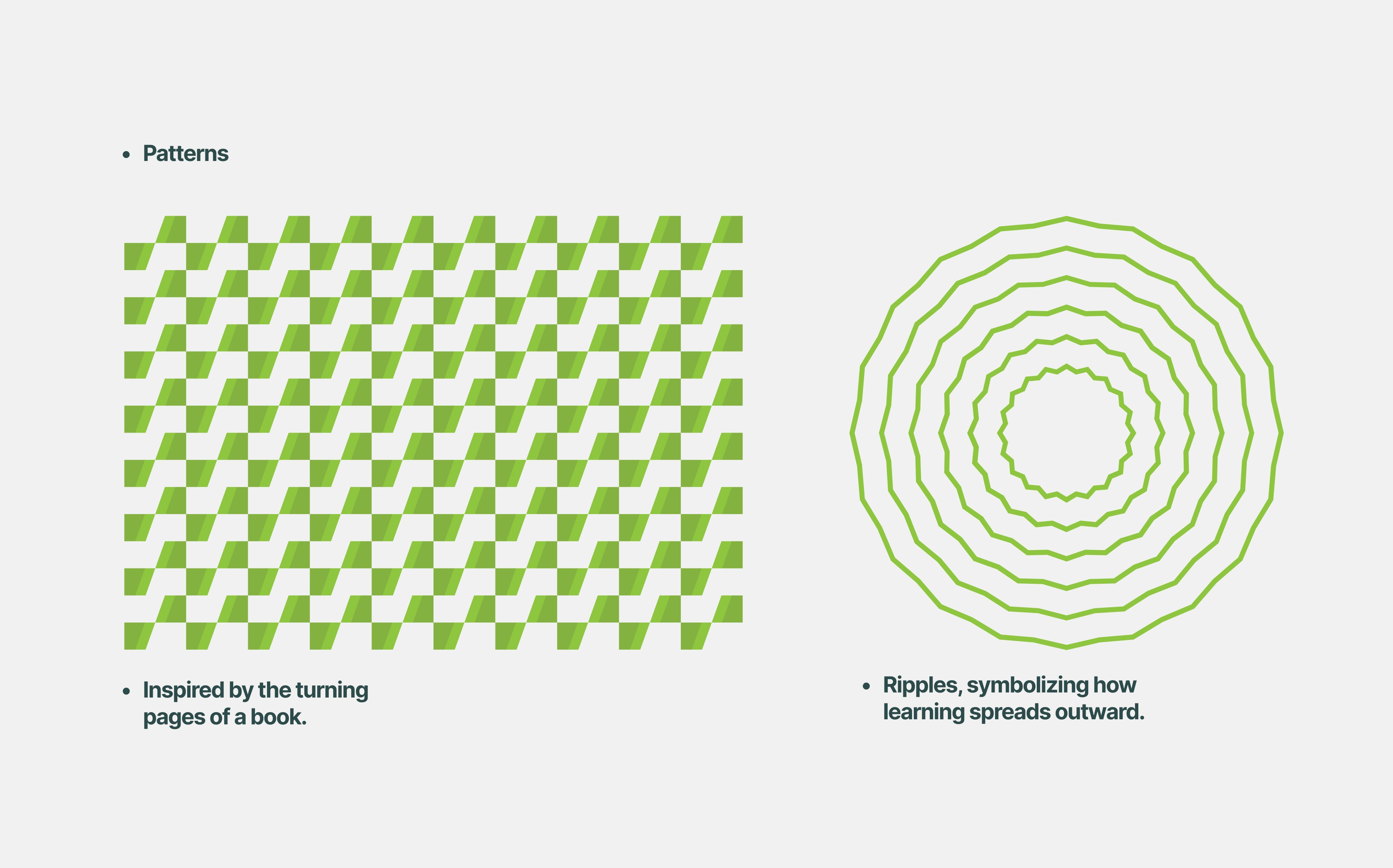 I created logo variations, patterns, and a library of graphic elements that extend the identity beyond logos and colors. The logomark is a bold "IN" balanced on a slightly angled platform—a lever that represents amplification through preservation. Two patterns anchor the system: Pattern 1.0 mirrors flipping book pages (the core identity), while Pattern 2.0 reflects ripples (how learning spreads). The graphic elements; maps, towers, steps, megaphones, archways etc; are built from the same geometric language, each representing different aspects of knowledge-sharing. The color system also was intended to reinforce the brand's values. The identity was designed to enhance the brand's message without overwhelming it, giving designers creative freedom while maintaining consistency. Everything connects back to one idea: providing a platform that turns knowledge into leverage.