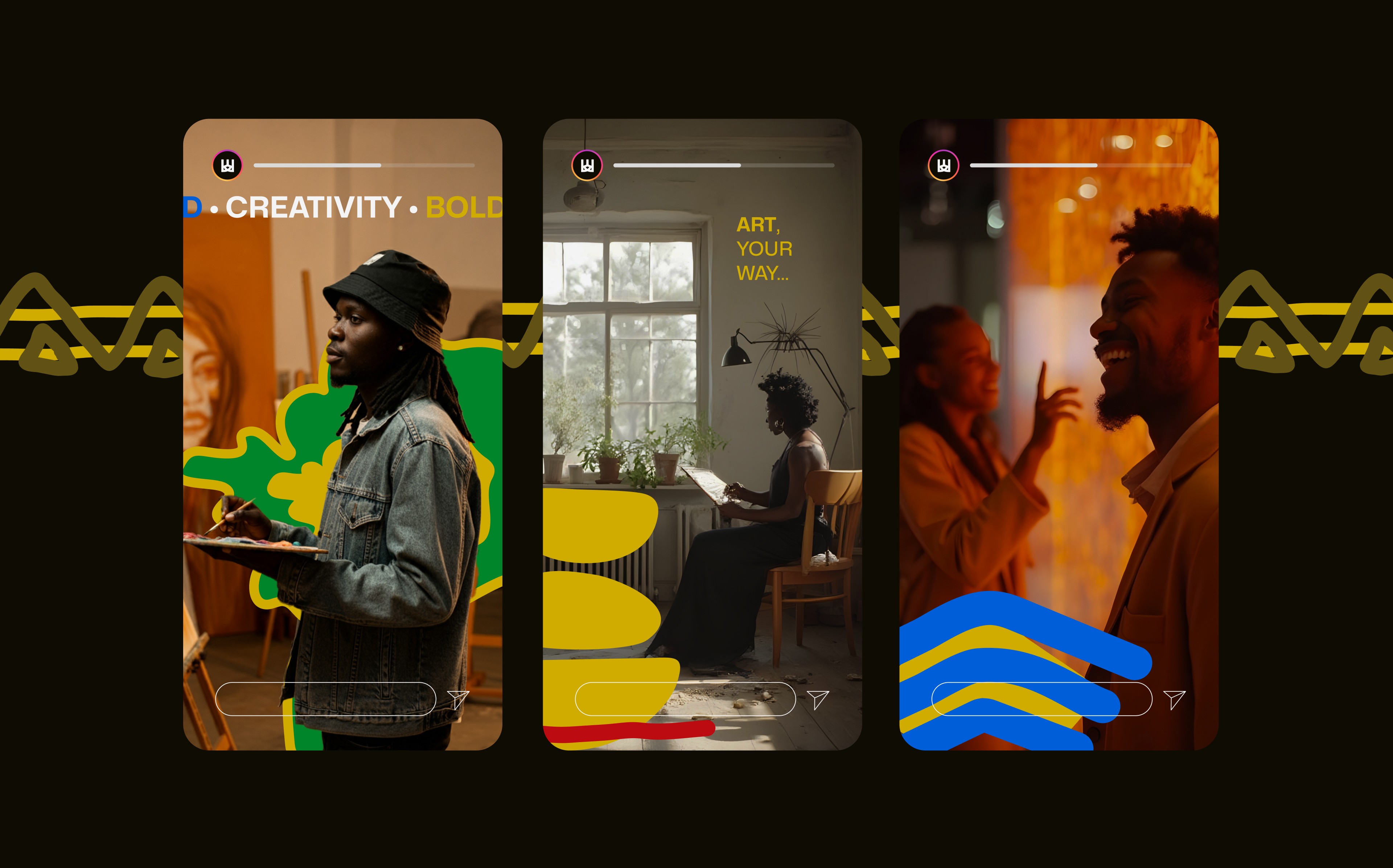 The crown logomark does double duty. It honors youth artistic efforts while pulling from African aesthetic traditions—"c(k)rown" merging identity with cultural reference. Black and white handle sophistication and neutrality. Blue builds trust and signals safety for emerging talent. Red, green, yellow (pulled from traditional African art) inject passion, growth, creativity without tipping into stereotype. Graphic elements carry specific meaning: layered forms represent culture and creativity stacking over time, pattern-like traditional symbols bridge eras, abstract fluid shapes show how young artists adapt across mediums. The minimal aesthetic is strategic. It creates space for unique stories and identities to take center stage, letting the artists' work do the talking while the brand provides structure.